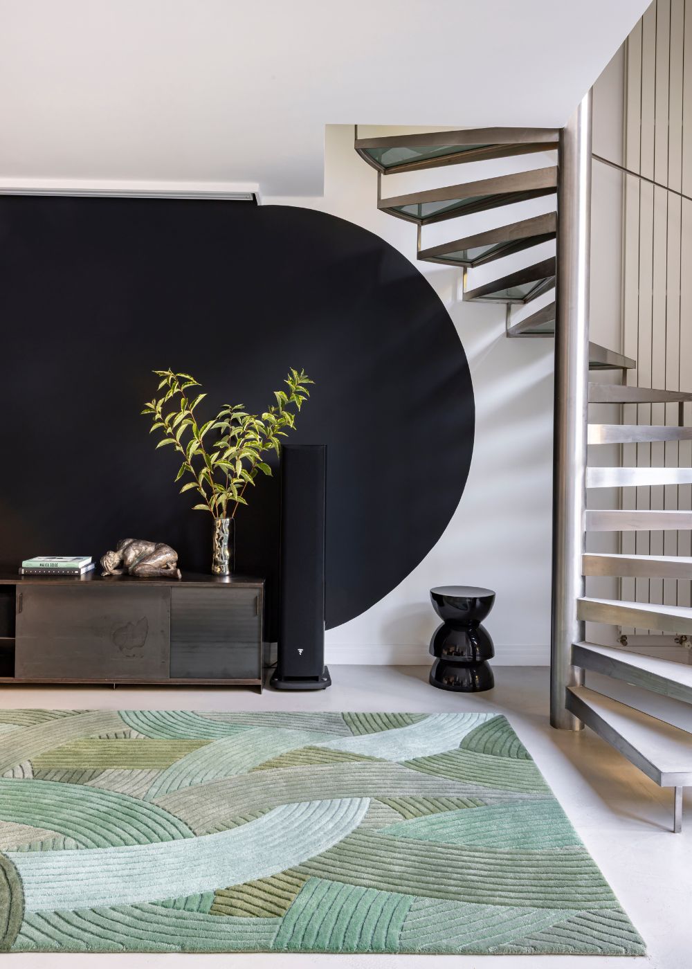 Tufté à la main, ce tapis 100% laine de Nouvelle-Zélande dessine d'élégantes courbes ciselées pour un intérieur chaleureux et contemporain, avec un subtil air inspiré des seventies.